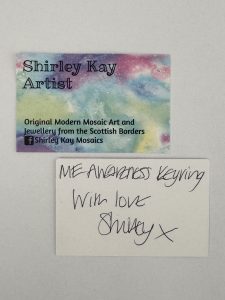 A big thank you to Team SalShirl who held a brilliant fundraiser within the Parents of children with ME/CFS support group. They raised an incredible £813.42 adding gift aid to make it £1,016.77 by selling these wonderful keyrings produced with Shirley Kay Mosaic’s design.