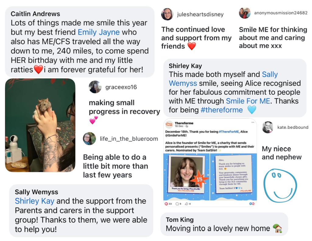 A special thank you to everyone who has donated, fundraised, supported on social media, nominated someone affected by ME for a Smile and donated items to include in our Smiles. Your support this year means more than words can say. We would not be able to do what we do without the kindness and generosity you show us. Thank you so very much.