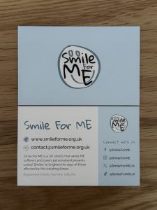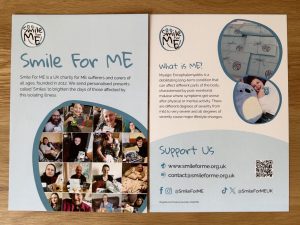 We are excited to share our new Smile For ME flyers and business cards. A big thank you to Amy who created them and also to all the people affected by ME who applied to design them. Thank you to the Smiles’ recipients who gave their permission for their photo to be included on our flyers. We have been using up our old stock but are now looking forward to including our new flyers in our March Smiles onwards.